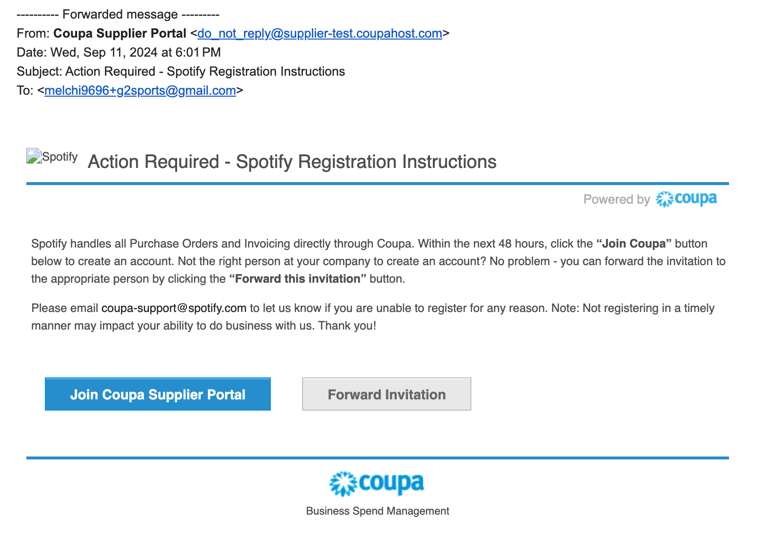 You can register a new account with Coupa; however, it will not be linked to Spotify unless you receive a Spotify welcome email. If you do not receive a welcome email, please reach out to coupa-support@spotify.com.